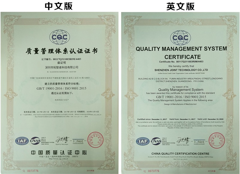 深圳市拓智者科技有限公司順利通過GB/T19001-2016/ISO9001:2015版質量管理體系認證工作,并獲得中國質量認證中心于12月11日頒發(fā)的《質量管理體系認證證書》,為捷甬達品牌機床的生產(chǎn)和銷售提供了前提保障。