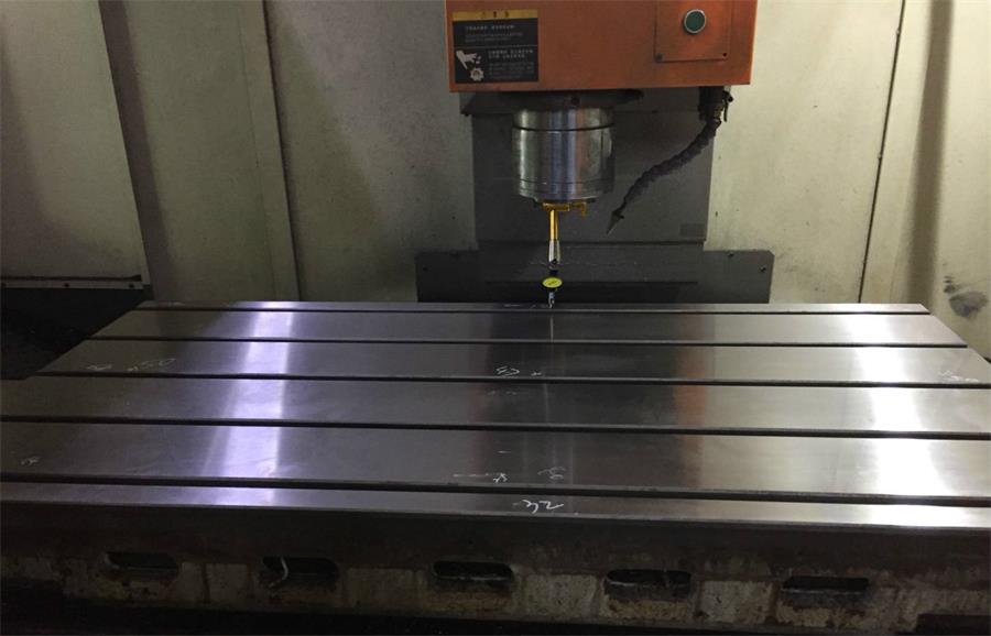 2、用行車把工作臺(tái)吊起翻轉(zhuǎn)過來,吊上機(jī)床,注意放到導(dǎo)軌上時(shí)不能壓碰到絲杠,放下后手拉工作臺(tái)靠緊基準(zhǔn)面,用手輪搖X軸把絲杠傳動(dòng)螺母鎖上2個(gè)螺絲,手輪來回移動(dòng)X軸使磨合接觸點(diǎn)清晰。架上千分表,打工作臺(tái)九點(diǎn)平面度,記錄數(shù)據(jù)。