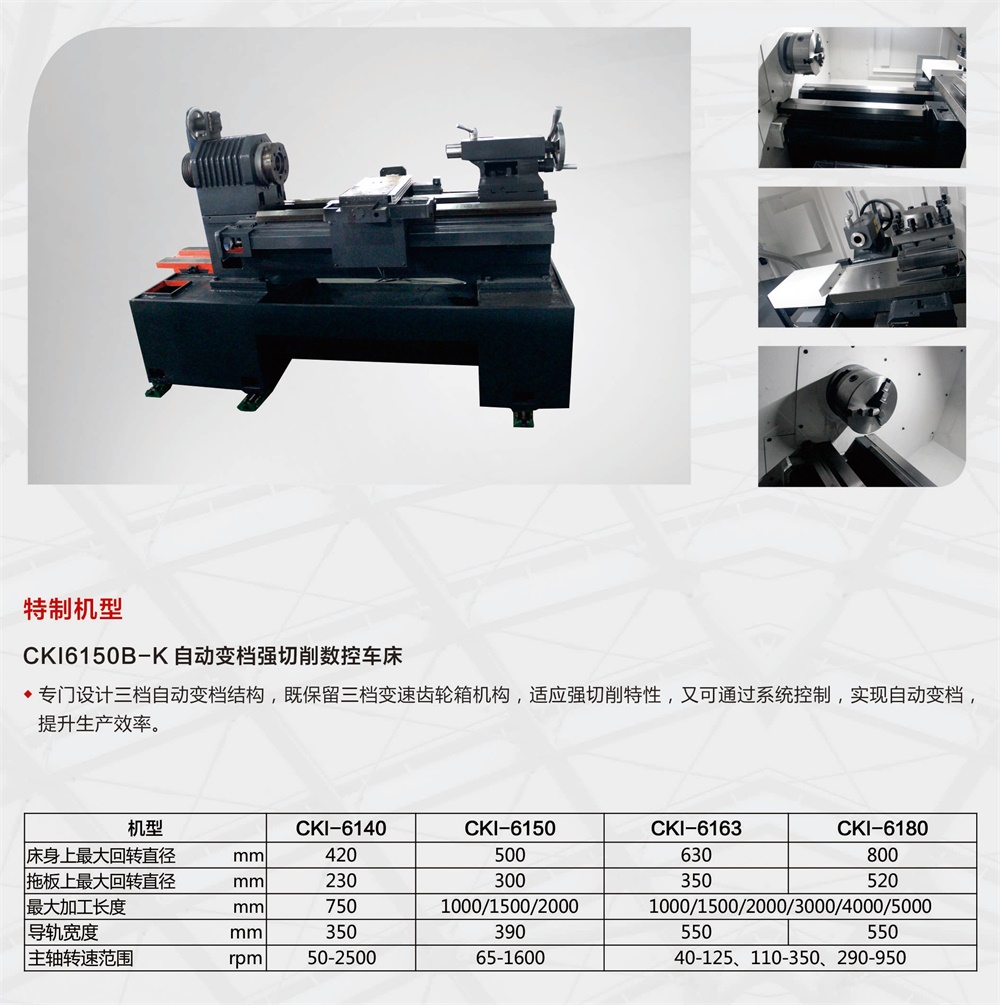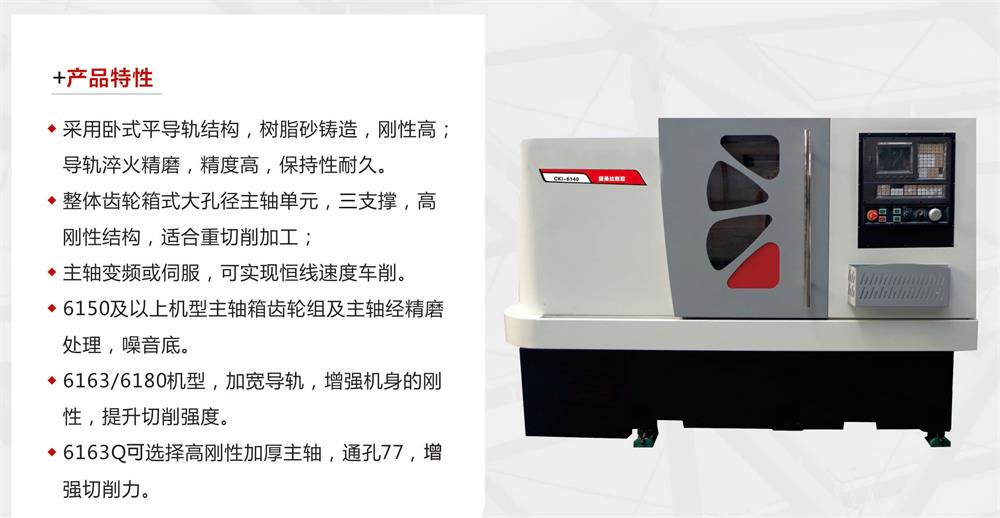 數(shù)控車床是市場上常見的普通車床的升級換代產(chǎn)品,對比普通數(shù)控車床,具有操作方便、加工質(zhì)量穩(wěn)定、加工工件光潔度高、全防護、切削液循環(huán)使用、環(huán)保性能好等特點。該類數(shù)控車床適用于加工軸類零件,螺紋、圓弧、圓錐及回轉(zhuǎn)體的內(nèi)、外曲面。6150及以上配置三檔變速箱,可以實現(xiàn)強力切削,滿足大切削量的加工要求。