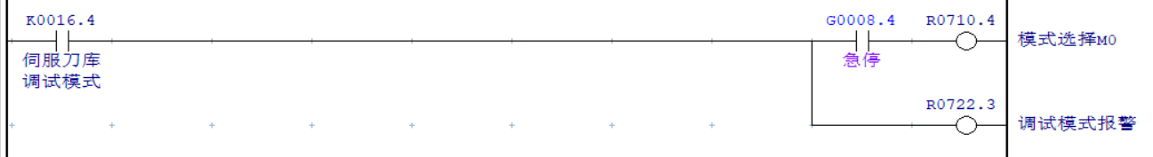 “模式選擇-M0”僅在刀庫寸動模式為“1”,該模式一般用于伺服刀庫的原點設置,屬于調試模式,機床正常使用過程無需用到該功能,因此使用K參數(shù)切換“0或1”的輸出。K參數(shù)開啟后,機床處于手動模式狀態(tài)(“模式選擇-M1”為“1”),即可激活伺服刀庫寸動模式。且進入該模式后刀庫處于調試模式,無法正常使用,同時需輸出刀庫處于調試模式的報警提示信息。