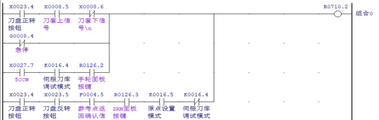 在 “模式選擇-M1”均為“1” “模式選擇-M0”均為“0”的狀態(tài)下,通過輸出“組合0”或“組合1”為“1”來試下刀盤的正反轉,為避免在刀套打下的情況下轉動刀盤導致刀庫損壞需同時與刀套上下信號做互鎖處理。