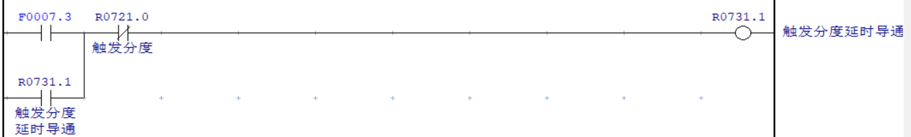 由于“自動分度模式”需在伺服驅動器在收到系統(tǒng)賦予的刀號后才能進行尋刀切該模式需觸發(fā)0.2秒以上才能進入,因此不能直接使用F7.3選刀信號進行觸發(fā)而使用中間繼電器,且延遲0.2秒導通并進行互鎖,確?!白詣臃侄饶J健笨梢哉S|發(fā)。刀盤選刀完成后導通SUB200功能指令進行刀盤換刀位置刀套內刀號與目標刀號的比較,一致時輸出R733.4信號打斷“自動分度模式” 互鎖,完成整個選刀過程。